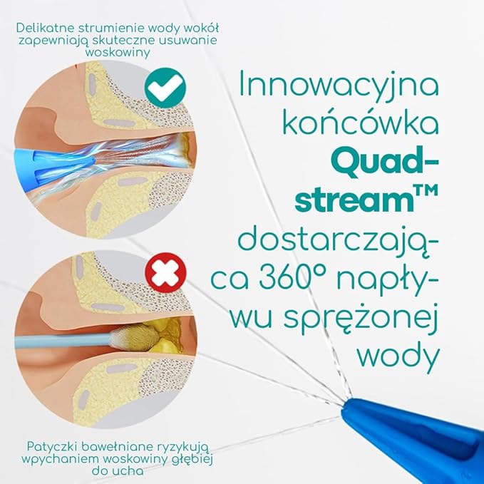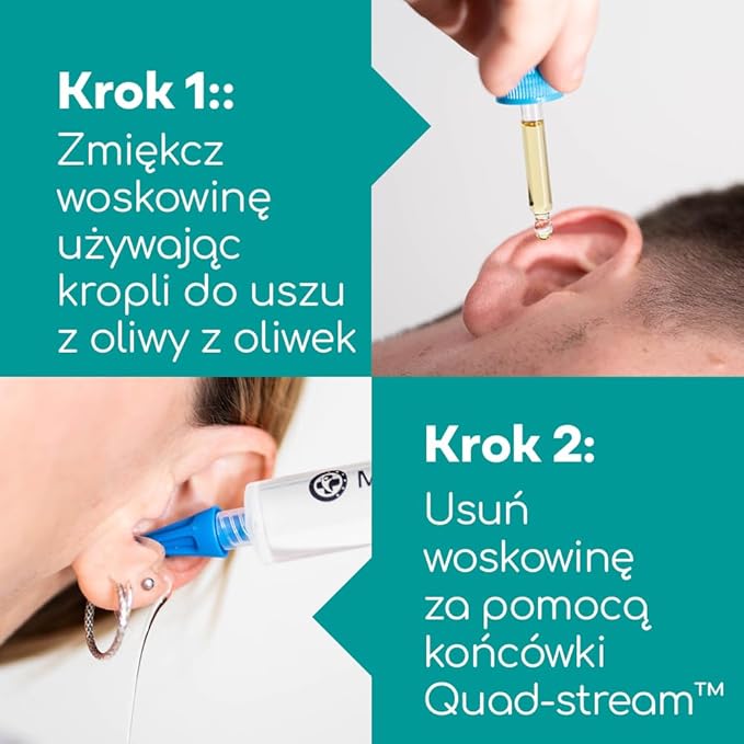 ✅ Bezpieczne i delikatne czyszczenie – Dzięki specjalnemu systemowi irygacji strzykawka usuwa nadmiar woskowiny bez ryzyka uszkodzenia błony bębenkowej czy podrażnienia kanału słuchowego. ✅ Innowacyjne końcówki Quad-Stream 360° – Unikalne, opatentowane końcówki (RCD 005657897-0001) zapewniają równomierny przepływ wody, skutecznie rozpuszczając nawet twardą woskowinę. Zestaw zawiera 3 kolorowe, wymienne końcówki dla wygody użytkowania. ✅ Kompletna pielęgnacja uszu – W zestawie znajdują się krople do uszu z oliwą z oliwek, które zmiękczają woskowinę na 1-2 tygodnie przed zabiegiem, ułatwiając jej usunięcie. Butelka z pipetą umożliwia precyzyjną aplikację. ✅ Łatwy w użyciu i higieniczny – Strzykawkę można szybko napełnić wodą, a dzięki ergonomicznemu kształtowi irygacja jest wygodna i kontrolowana. Dołączona wielojęzyczna instrukcja sprawia, że korzystanie z zestawu jest intuicyjne. ✅ Skuteczniejszy niż patyczki kosmetyczne – W przeciwieństwie do tradycyjnych metod, które mogą wepchnąć woskowinę głębiej, strzykawka Medi Grade bezpiecznie wypłukuje zanieczyszczenia, zapewniając długotrwałą czystość.